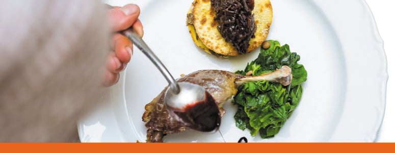- Baraviku krēms, kas papildināts ar Knorr sēņu buljonu un cepta cūkgaļas fileja, kas pildīta ar žāvētām plūmēm, pasniegta ar demi-glace mērci un grauzdētiem dārzeņiem.