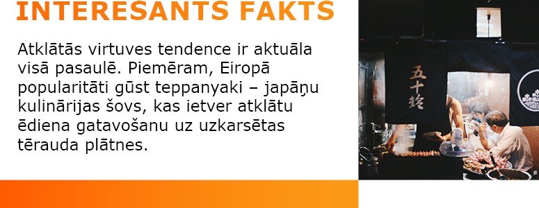 Tendences ir mainījušās, bet atvērtās virtuves ir aktuālas vēl aizvien. Reizēm ēdiens tiek gatavoti aiz stikla sienas, reizēm pie letes, bet citreiz – ko uzdrīkstas tikai paši drosmīgākie – tieši uz virtuves saliņas istabas vidū, kur šefpavāru darbībās noraugās vērīgās viesu acis.