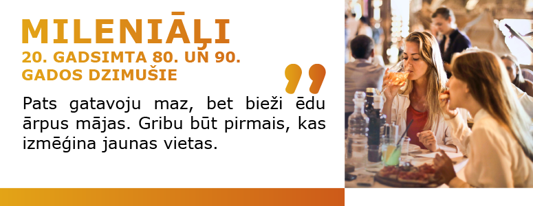 Šī ir paaudze, kas tērē vismazāk laika pārtikas sagatavošanai. Tomēr aizvien vairāk mileniāļu izvēlas ēdienu līdzņemšanai (takeaway) un ēdiena piegādi mājās - vairāk nekā 62%. Šie steidzīgie jaunie cilvēki regulāri izmanto pārtikas pasūtīšanas lietotnes un sagaida elastīgus pārtikas piegādes pakalpojumus.